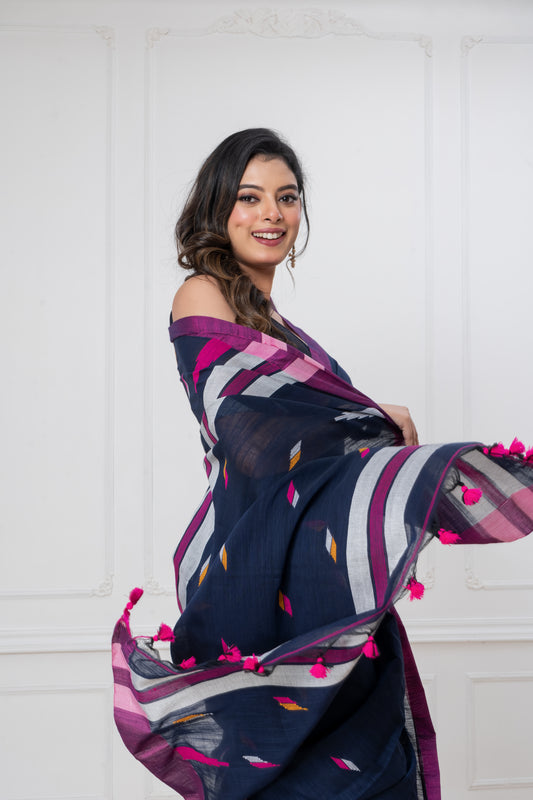 Royal Blue Mul Cotton Saree with Jamdani Weaving and Tassels
