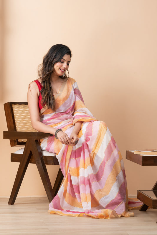 Orange & Pink Colorblocked Mul Cotton Saree with Zari and Tassels