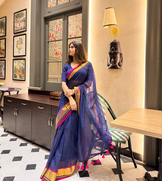Navy Blue Handloom Mul Cotton Saree with Zari and Tassels