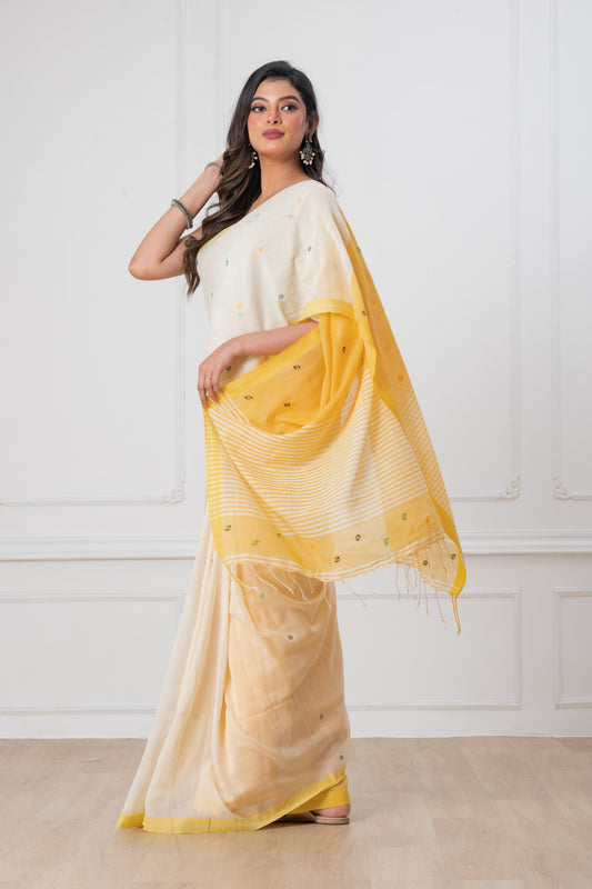 Off White & Yellow Handloom Mark Mul Cotton Jamdani Saree