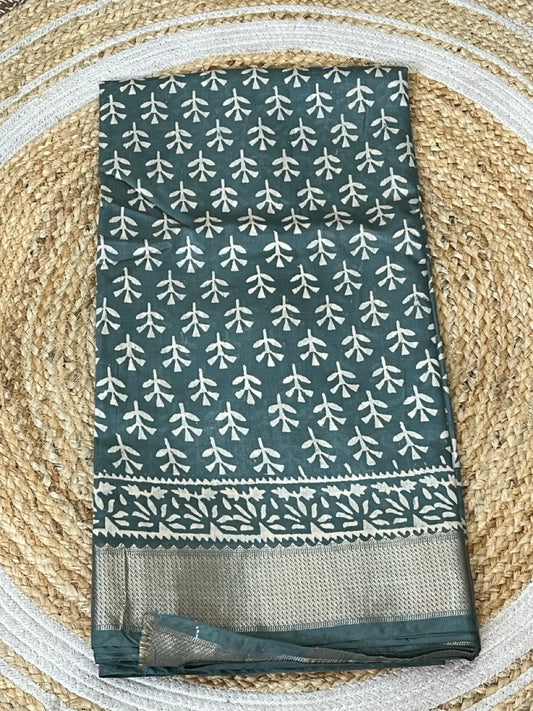 Teal Green Handblock Printed Maheshwari Silk Saree