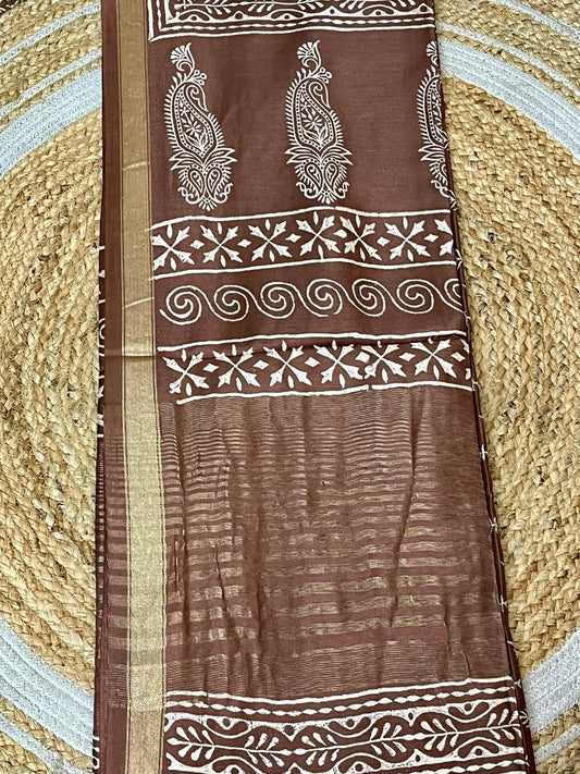 Brown Bagru Handblock Printed Mul Cotton Saree