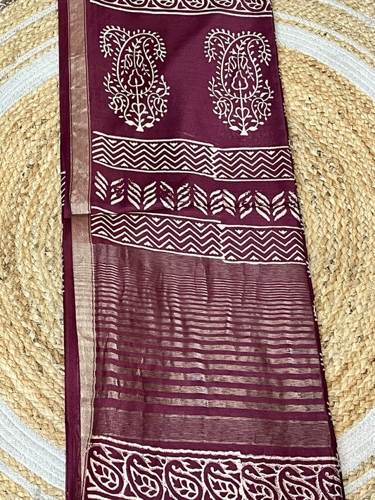 Maroon Handblock Printed Crepe Saree with Zari Border