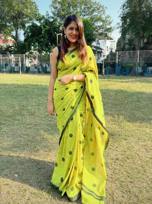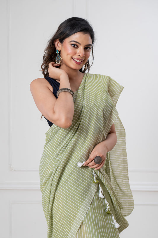 Lime Green Khadi Cotton All Over Stripes Saree with Tassels