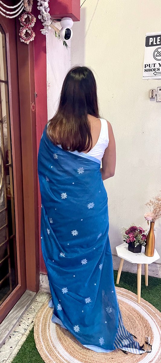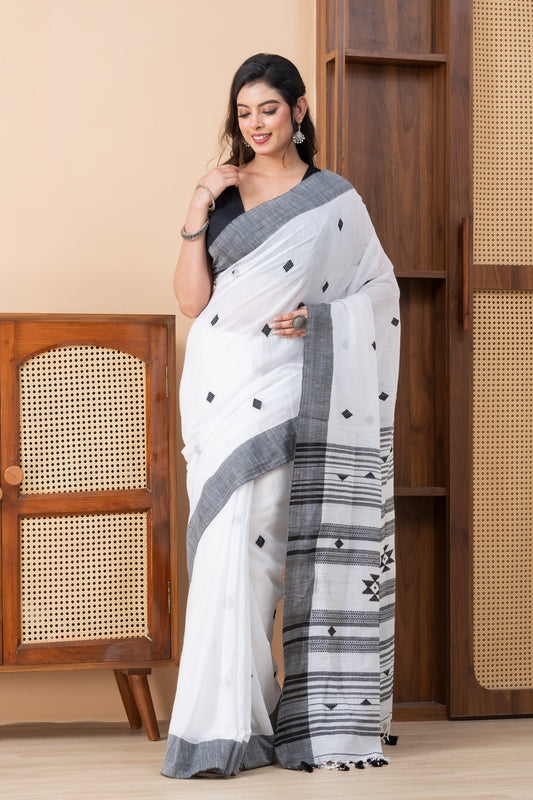 White Khadi Cotton Saree with Heavy Embroidered Palla and Tassels