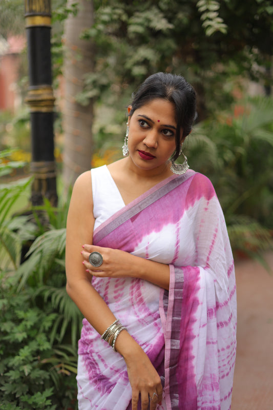 White and Pink Khadi Cotton Tie Dye Shibori Saree