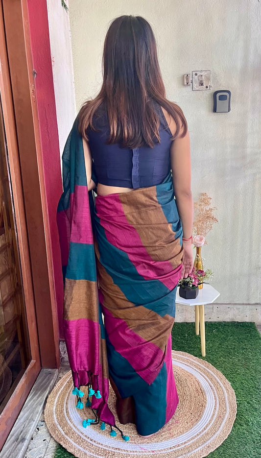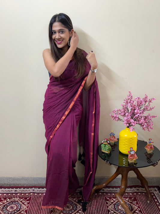 Purple Solid Khadi Cotton Saree with Green Border and Tassels