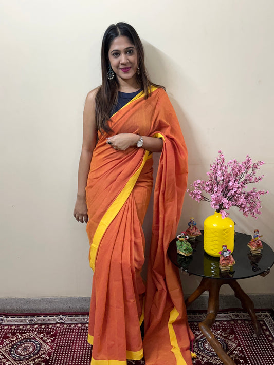 Orange Solid Khadi Cotton Saree with Yellow Border and Tassels