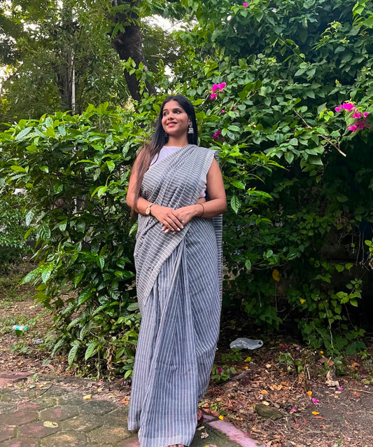 Grey Khadi Cotton All Over Stripes Saree with Tassels