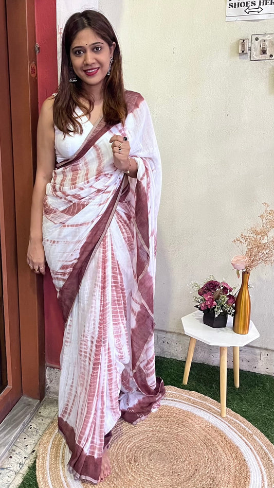 White and Brown Khadi Cotton Tie Dye Shibori Saree