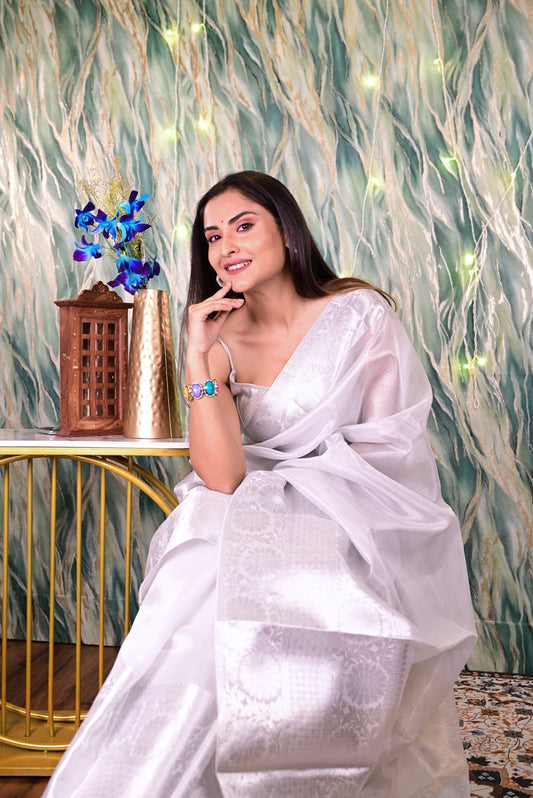 Silver Semi Silk Banarasi Saree with Intricate Weaving Broad Border