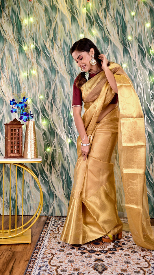 Golden Semi Silk Banarasi Saree with Intricate Weaving Broad Border
