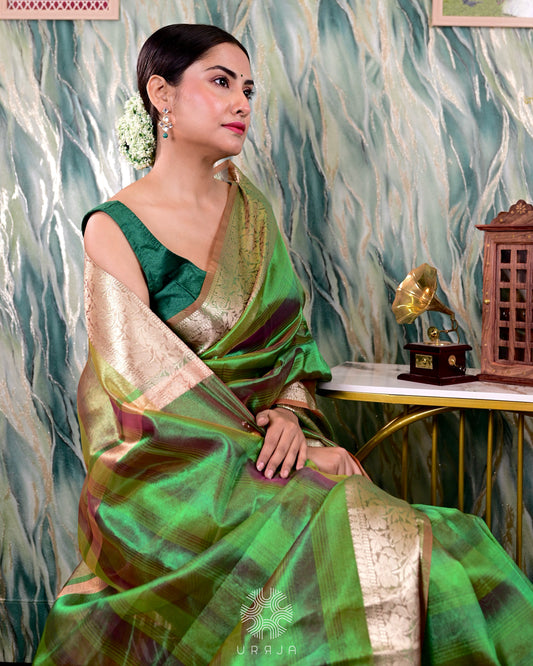 Green Semi Silk Banarasi Saree with All Over Stripes