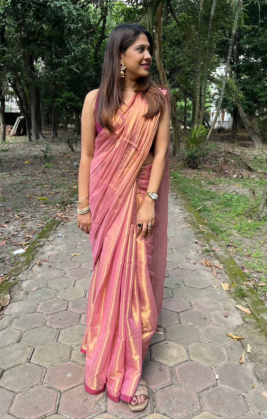 Pastel Pink Dual Tone Linen Tissue Saree with Zari and Tassels