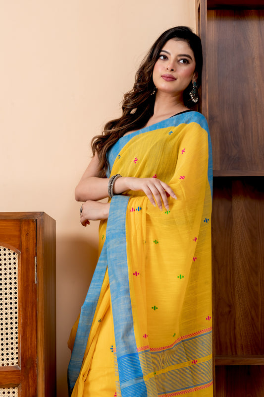 Yellow Handloom Mark Pure Cotton Jamdani Saree with Tassels