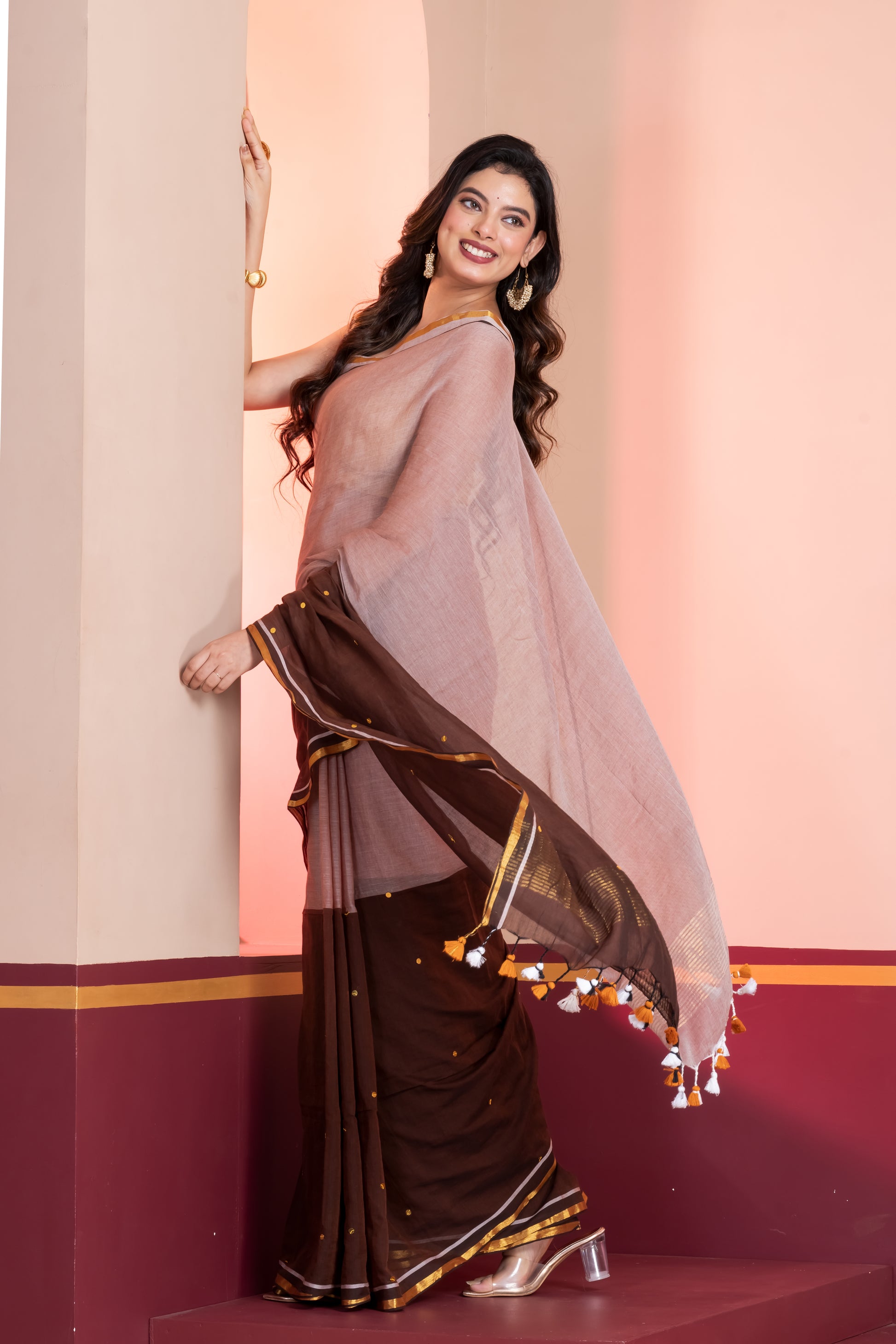 Brown Colourblocked Handloom Mul Cotton Saree with Sequence, Zari and Tassels
